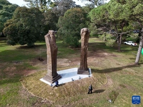 這是5月29日在烏拉圭首都蒙得維的亞市中心的巴特列公園拍攝的雕塑作品《問道》(無(wú)人機(jī)照片)。新華社發(fā)(尼古拉斯·塞拉亞攝)