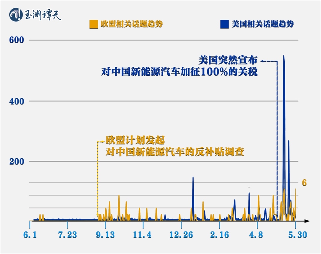 譚主分地區(qū)集納了過去一年外媒關(guān)于“對中國新能源汽車加征關(guān)稅”的報道,發(fā)現(xiàn)美國和歐洲地區(qū)出現(xiàn)了明顯的錯峰:
