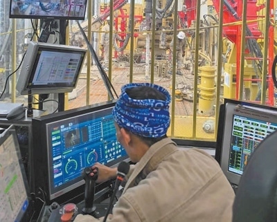 通過(guò)參與艾伯特湖區(qū)油田建設(shè),東方宏華還研發(fā)出“一鍵聯(lián)動(dòng)”舉升式排管系統(tǒng),以舉升移運(yùn)、多系統(tǒng)協(xié)同、離線作業(yè)、智能感知、一鍵集控五大技術(shù)為核心,實(shí)現(xiàn)在地面、臺(tái)面和高空三大區(qū)域的自動(dòng)化作業(yè)?!坝辛宋覀冏灾餮邪l(fā)的智能系統(tǒng)加持,操作人員只需點(diǎn)擊屏幕,就可以完成接立柱和鉆井等操作?!睎|方宏華所屬宏華電氣副總經(jīng)理汪虹宇介紹。
