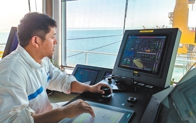 工作人員在“新海鯊”輪駕駛艙操作設(shè)備。本報(bào)記者 管克江攝