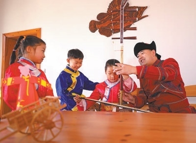 哈拉新村村民在教當(dāng)?shù)睾⒆友葑鄠鹘y(tǒng)樂器。齊齊哈爾大學(xué)孟加拉國籍留學(xué)生 衣睿實攝“在哈拉新村,我看到四弦琴造型的村口大門、魚叉狀的路燈,還有整整齊齊的‘介字房’……這里獨特的民族文化、濃郁的鄉(xiāng)土風(fēng)情,給我留下了深刻印象。當(dāng)?shù)丶缺A魝鹘y(tǒng)的達斡爾族人文特征,又開發(fā)文化體驗館、民族特色美食等現(xiàn)代旅游資源,重視文化保護和傳承的做法值得借鑒。”