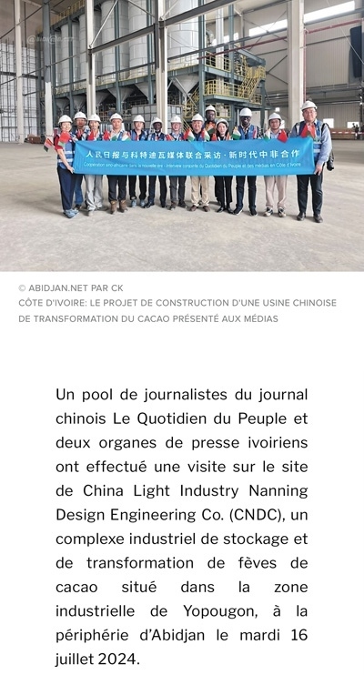 7月16日,人民日報與兩家科特迪瓦新聞機構記者一行參觀了由中國輕工業(yè)南寧設計工程有限公司總承包的可可加工及可可豆倉庫建設項目,該項目坐落在阿比讓郊區(qū)的約普貢工業(yè)區(qū)。該公司負責人指出,該項目綜合體計劃于2024年年底完工,包括一個可加工5萬噸可可豆的工廠、可存儲14萬噸可可豆的倉庫以及培訓中心、行政大樓等。——摘自科特迪瓦阿比讓網(wǎng)報道