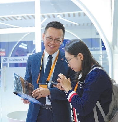 服貿(mào)會(huì)期間,法國(guó)智奧會(huì)展集團(tuán)工作人員與參展觀眾洽談業(yè)務(wù)。歐陽功成攝