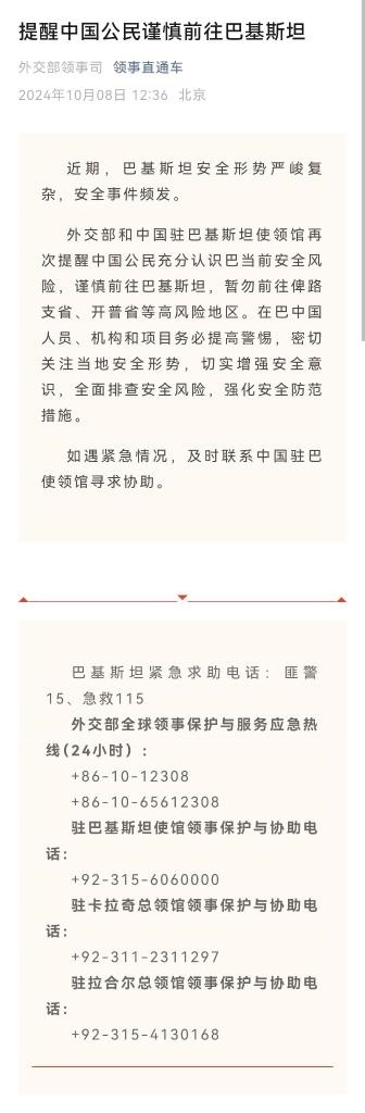 據(jù)外交部“領(lǐng)事直通車”微信公眾號(hào)10月8日消息,近期,巴基斯坦安全形勢嚴(yán)峻復(fù)雜,安全事件頻發(fā)。