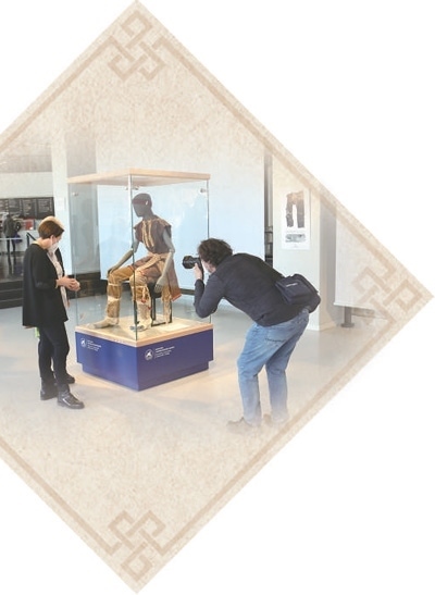 加入科研團(tuán)隊(duì)的德國服裝設(shè)計(jì)師卡特琳·迪爾斯娜第一次接觸古代服飾文物,但多年來為歷史題材電影和戲劇制作服飾的經(jīng)驗(yàn)對(duì)她很有幫助。此次全套服裝包括素絹高領(lǐng)短衫、粉色拼接藍(lán)色羊毛束口長褲、與長褲同色系的羊毛短靴(靴口為素絹)、素色絲質(zhì)裹身半裙、裝飾與配色同樣考究的套頭長袍,以及下緣綴有風(fēng)琴褶的淺金拼淡玫紅色絲質(zhì)大衣——經(jīng)過科學(xué)復(fù)原,古代服飾的時(shí)尚審美與紡織技藝令人嘆服,衣物主人的綽約風(fēng)姿也穿越千年風(fēng)沙,宛在眼前?!翱吹竭@些服裝一件件穿在真人模特身上,完美地隨身搖擺,我被深深打動(dòng)。那一刻,我和2000多年前的人與物情感相連,感受相通。”迪爾斯娜說。