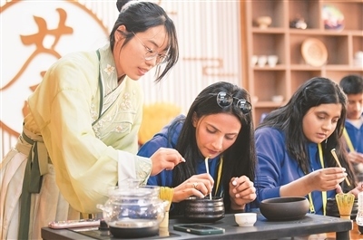 2024年4月15日,2024年“漢語橋”上海合作組織國家青年學生春令營開營儀式在新疆師范大學舉行。來自8個上合組織國家的近500名青年學生參加了此次春令營。圖為參加春令營的來華青年學生在新疆師范大學學生(左)的指導(dǎo)下學習茶藝。