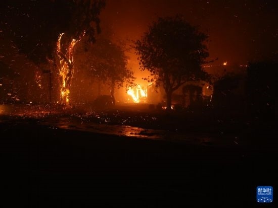 1月7日,在美國加利福尼亞州南部洛杉磯縣沿海社區(qū)帕西菲克帕利塞茲,野火吞噬房屋。