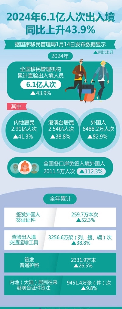 在2024年中國國際傳播年度熱詞榜上,“中國游”一詞名列前十。中國全面放寬優(yōu)化免簽政策,推出一系列便利外國人來華政策舉措,“中國游”成為越來越多外國游客的優(yōu)先選擇。中國國家移民管理局最新數(shù)據(jù)顯示,2024年,全國移民管理機(jī)構(gòu)累計查驗(yàn)出入境人員6.1億人次,同比上升43.9%;其中內(nèi)地居民2.91億人次、港澳臺居民2.54億人次、外國人6488.2萬人次,同比分別上升41.3%、38.8%、82.9%。全國各口岸免簽入境外國人2011.5萬人次,同比上升112.3%。說走就走的“中國游”打開了世界了解中國的新窗口、新通道,向全球展現(xiàn)真實(shí)、多元和活力滿滿的中國形象。