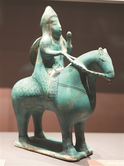 綠松石色釉小型樂隊模型為公元12—13世紀的作品,其結構呈方形,表現(xiàn)了樂隊演奏或宴會場景,11名樂手分別演奏鐃鈸、鼓、琴、長笛等樂器,場地中央置一果盤。藍釉黑彩騎士陶塑刻畫了具有東亞特征面孔的騎士形象。騎士頭戴尖頂帽,背負盾牌,其造型受到中國藝術的影響。