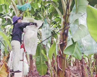 在柬埔寨磅湛省地澤香蕉園,蕉農正給香蕉果實套袋。