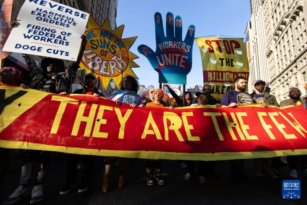 5月1日,人們手持標(biāo)語(yǔ)在美國(guó)紐約參加抗議特朗普政府政策的集會(huì)和游行。新華社發(fā)(郭克攝)