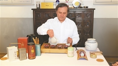 品茶已經(jīng)成為許多意大利人的日常生活習慣。意大利茶業(yè)與花草茶協(xié)會主席馬可·貝托納十分喜愛中國茶,并收藏有正山小種、普洱茶等多種中國名茶。圖為馬可·貝托納在展示茶藝。