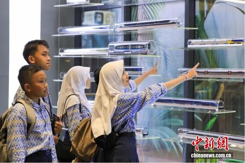 當(dāng)?shù)貢r(shí)間2024年10月17日,一群印尼學(xué)生在印尼雅加達(dá)的雅萬高鐵動(dòng)車組科普文化交流基地參觀。 中新社記者 李志全 攝