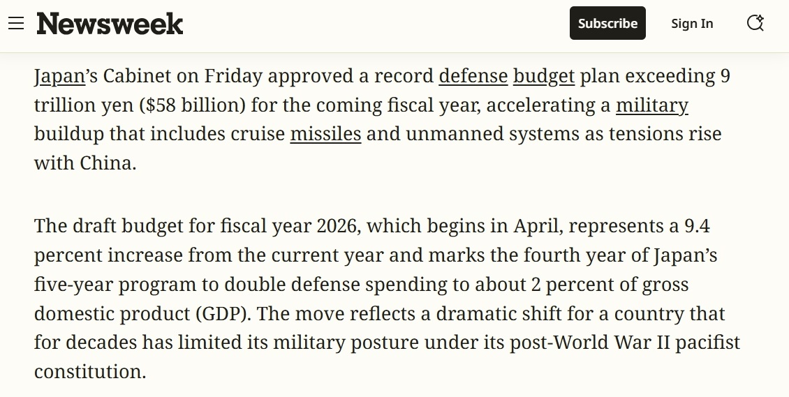美國《新聞周刊》的報道稱,日本2026財年防衛(wèi)預(yù)算比今年增加了9.4%。新預(yù)算的一個重點是加強日本“遠距離打擊敵方目標的能力”,這大大偏離了日本長期以來嚴格限制使用武力用于自衛(wèi)的原則。
