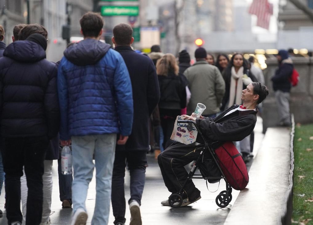 12月18日,一名男子在美國紐約曼哈頓街頭尋求救助。新華社記者張鳳國攝