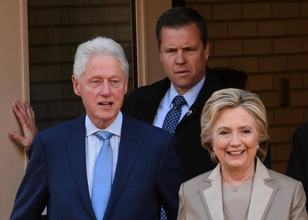 2016年11月8日,在美國紐約州查帕闊一處投票站,民主黨總統(tǒng)候選人希拉里·克林頓(前右)與她的丈夫、前總統(tǒng)比爾·克林頓(前左)參加大選投票。新華社記者殷博古攝