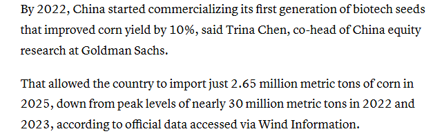 報道還稱,中國在農(nóng)業(yè)研究與開發(fā)方面投入巨大,2019年至2021年其公共部門在這方面的支出大約是美國的兩倍。報道援引高盛中國股票研究部聯(lián)席主管的觀點稱,到2022年,中國已開始將第一代生物育種產(chǎn)業(yè)化應(yīng)用,這些種子使玉米產(chǎn)量提高了10%。報道還援引萬得資訊獲得的官方數(shù)據(jù)稱,這使得中國在2025年的玉米進口量僅為265萬噸,遠低于2022年和2023年近3000萬噸的峰值水平。