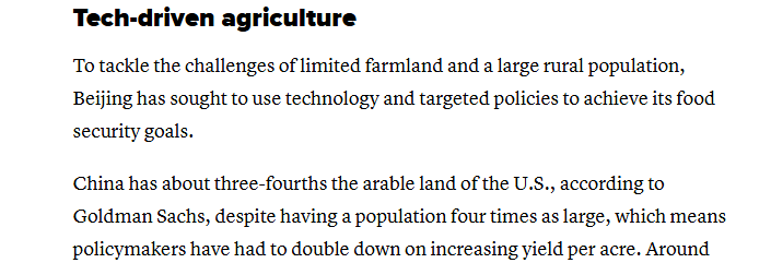 美國消費者新聞與商業(yè)頻道援引高盛集團的數(shù)據(jù)報道稱,中國擁有的耕地面積約為美國的四分之三,但人口是美國的四倍之多,這意味著中國的政策制定者必須加倍努力提高每畝土地的產(chǎn)量。