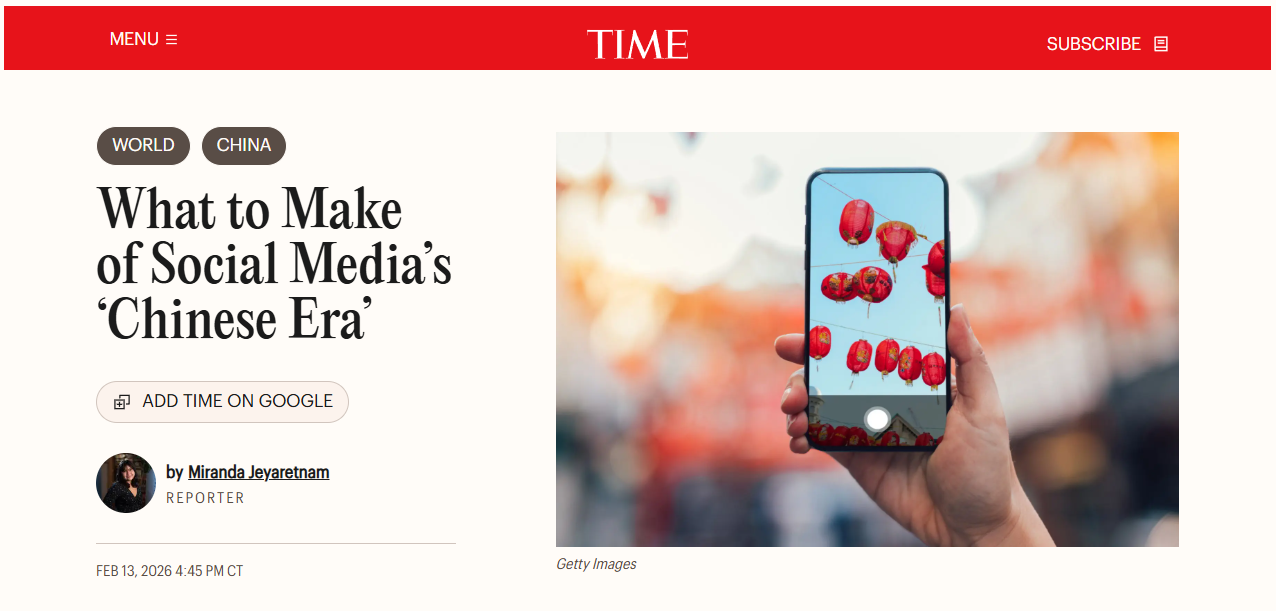 美國《時代》周刊網(wǎng)站2月13日的一篇文章稱,伴隨著今年的中國新年,社交網(wǎng)絡(luò)上介紹中國文化的內(nèi)容不少。這是一種新的趨勢,美國社交媒體用戶視自己為“中國人”,擁抱“Chinese era”(中國時代)或者“Chinamaxxing”(極致中國化)。觀察家分析,這一趨勢反映了隨著中國的開放和軟實(shí)力的提升,人們對中國越來越著迷。