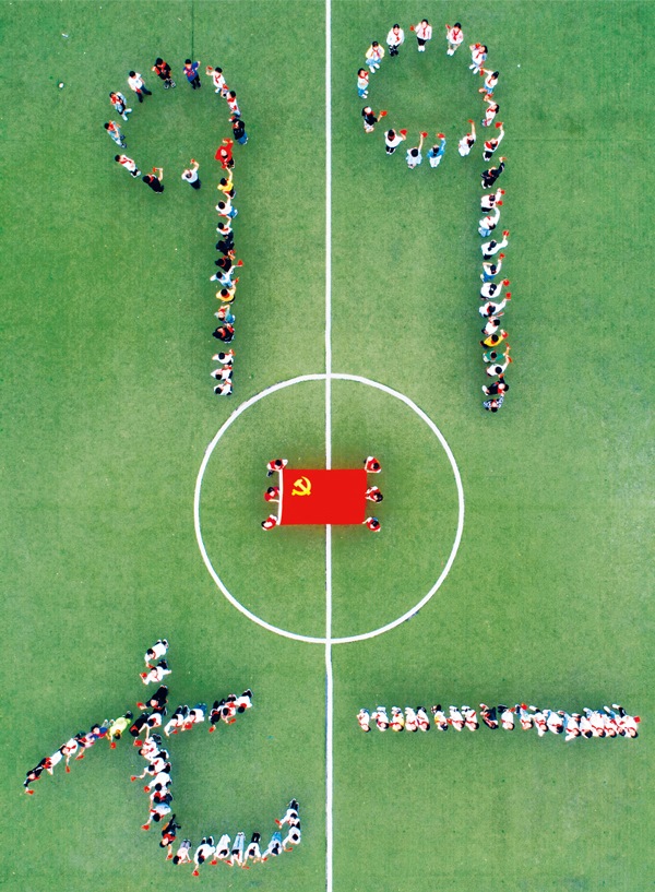 2020年6月30日,江蘇省泰州市大馮中心小學(xué)開展“童心向黨迎七一”主題班會(huì),通過(guò)給學(xué)生上黨課、講黨史等方式,讓學(xué)生了解黨的光輝歷程,迎接中國(guó)共產(chǎn)黨建黨99周年。圖為活動(dòng)中擺出的“七一”、“99”和黨旗的組合圖案。中新社發(fā)湯德宏/攝