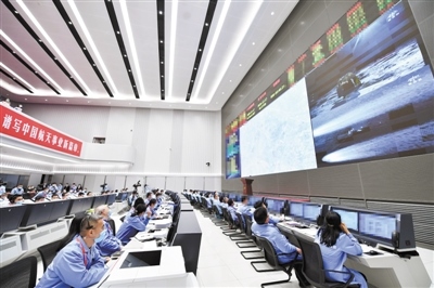 12月17日,工作人員在北京航天飛行控制中心嫦娥五號(hào)任務(wù)飛控現(xiàn)場(chǎng)觀看返回器攜帶月球樣品安全著陸。新華社記者 岳月偉攝