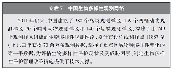 完善監(jiān)測觀測網(wǎng)絡(luò)。中國建立起各類生態(tài)系統(tǒng)、物種的監(jiān)測觀測網(wǎng)絡(luò),在生物多樣性理論研究、技術(shù)示范與推廣以及物種與生境保護(hù)方面發(fā)揮了重要作用,為科研、教育、科普、生產(chǎn)等各領(lǐng)域提供了多樣化的信息服務(wù)與決策支持。其中,中國生態(tài)系統(tǒng)研究網(wǎng)絡(luò)(CERN)、國家陸地生態(tài)系統(tǒng)定位觀測研究網(wǎng)絡(luò)(CTERN)涵蓋所有生態(tài)系統(tǒng)和要素,中國生物多樣性監(jiān)測與研究網(wǎng)絡(luò)(Sino BON)覆蓋動物、植物、微生物等多種生物類群,中國生物多樣性觀測網(wǎng)絡(luò)(China BON)構(gòu)建了覆蓋全國的指示物種類群觀測樣區(qū)。
