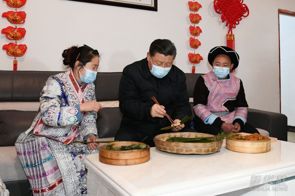 2021年2月3日至5日,習(xí)近平來到貴州考察調(diào)研,看望慰問各族干部群眾,向全國(guó)各族人民致以美好的新春祝福。這是3日下午,習(xí)近平在畢節(jié)市黔西縣新仁苗族鄉(xiāng)化屋村苗族村民趙玉學(xué)家,同趙玉學(xué)一家邊聊家常邊制作當(dāng)?shù)貍鹘y(tǒng)節(jié)日食品黃粑。