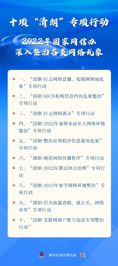 新華社北京3月17日電(記者王思北)記者17日從國新辦舉行的新聞發(fā)布會獲悉,2022年“清朗”系列專項行動將重點開展打擊網絡謠言,打擊網絡直播、短視頻領域亂象,算法綜合治理,暑期未成年人網絡環(huán)境整治等十方面任務?! ?/p>