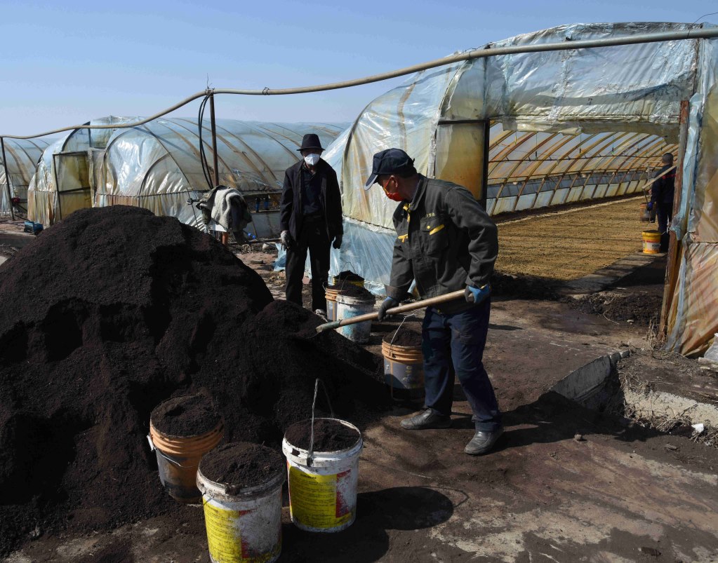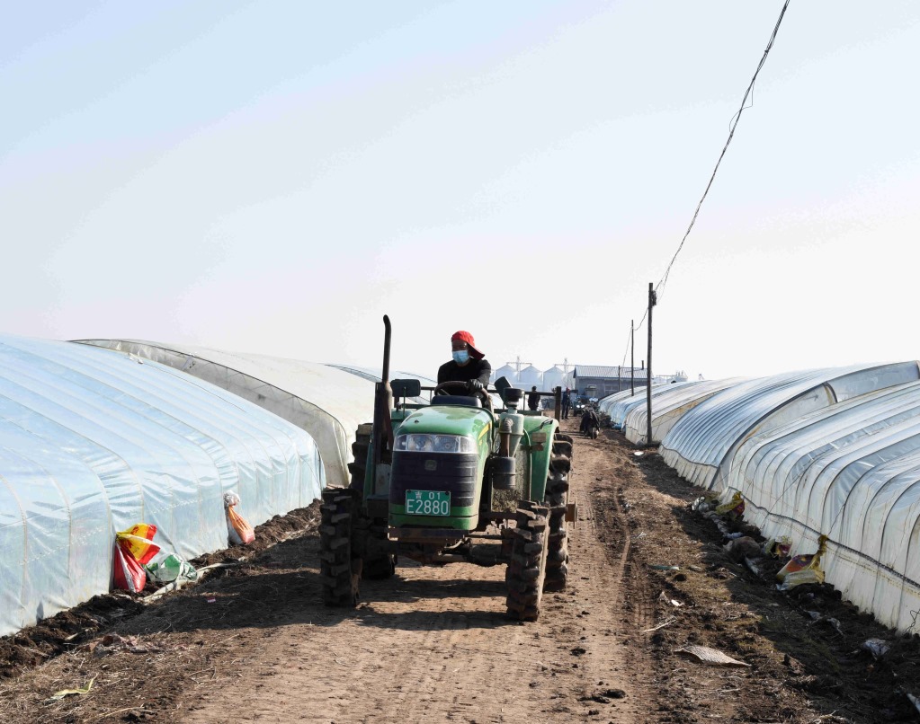 4月2日,在五常市友好村烏拉巴街屯,村民正在將土運進大棚。新華社記者梁書斌攝