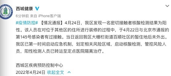 4月24日,我區(qū)(北京市西城區(qū))發(fā)現(xiàn)一名密切接觸者核酸檢測(cè)結(jié)果為陽(yáng)性。該人員在對(duì)位于其他區(qū)的住所進(jìn)行裝修的過(guò)程中,于4月22日與北京市通報(bào)的第145號(hào)感染者有過(guò)接觸。當(dāng)日返回我區(qū)大柵欄街道百順社區(qū)的暫住地后未外出。