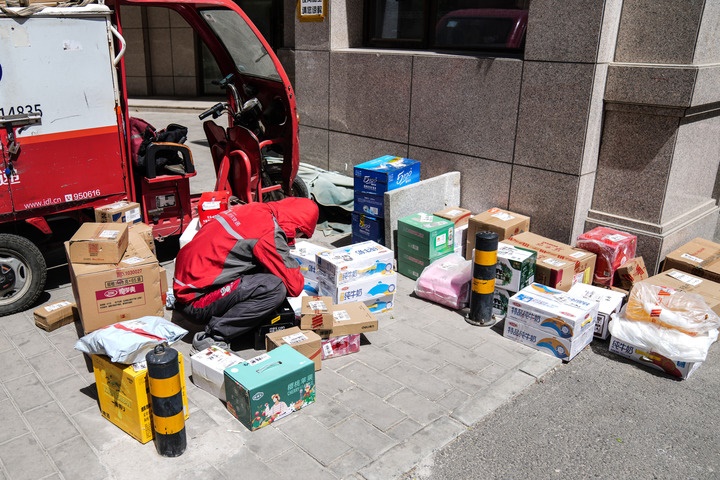 2022年4月26日,在北京市一小區(qū)門口,快遞員在整理貨品準(zhǔn)備投遞。新華社記者彭子洋攝