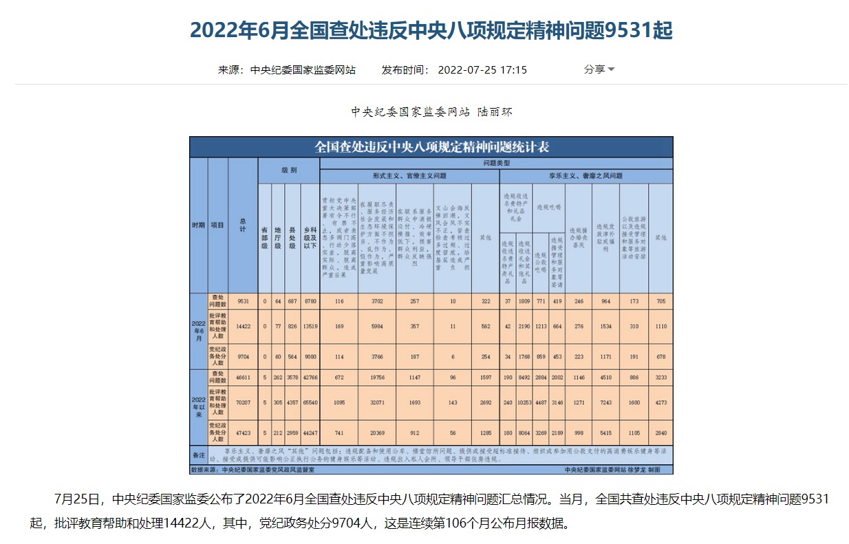 從公布的月報數(shù)據(jù)看,當(dāng)月(6月),全國共查處違反中央八項規(guī)定精神問題9531起,批評教育幫助和處理14422人,其中,黨紀(jì)政務(wù)處分9704人。