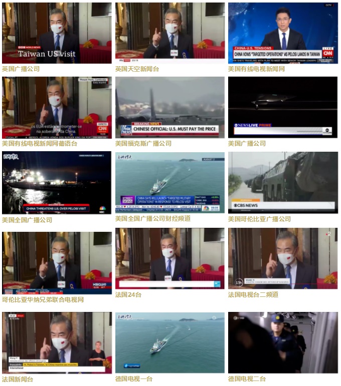 總臺(tái)國際視頻通訊社聚焦外交部、國臺(tái)辦、東部戰(zhàn)區(qū)等權(quán)威表態(tài),可視化制作編發(fā)《國際銳評(píng)》《玉淵譚天》等相關(guān)評(píng)論言論。截至8月4日10時(shí),共有84條新聞素材得到BBC、CNN、CNBC、英國天空新聞臺(tái)、法國24臺(tái)、法國電視臺(tái)、法國新聞臺(tái)、德國電視一臺(tái)、德國電視二臺(tái)、德國之聲、意大利廣播電視公司、意大利TGCOM24電視臺(tái)、加拿大廣播公司、加拿大最大的商業(yè)電視網(wǎng)CTV、俄羅斯第一頻道、全俄國家電視廣播公司、日本NHK、韓國KBS、巴西環(huán)球電視臺(tái)、印度國家電視臺(tái)、新加坡亞洲新聞臺(tái)、澳大利亞廣播公司、卡塔爾半島電視臺(tái)、墨西哥阿茲特克電視臺(tái)、印尼國家廣播電視臺(tái)等102個(gè)國家和地區(qū)的1683個(gè)電視臺(tái)及新媒體平臺(tái)采用。國際視頻通訊社還特別面向中國臺(tái)灣地區(qū)的媒體進(jìn)行精準(zhǔn)投送,實(shí)現(xiàn)臺(tái)灣地區(qū)主流電視臺(tái)全覆蓋,落地效果突出:臺(tái)灣東森電視臺(tái)、臺(tái)灣無線衛(wèi)星電視臺(tái)(TVBS)、臺(tái)灣中華電視臺(tái)、臺(tái)灣中天電視臺(tái)等共有13個(gè)臺(tái)灣電視臺(tái)及采用播出744次,播出總時(shí)長(zhǎng)3小時(shí)26分44秒。
