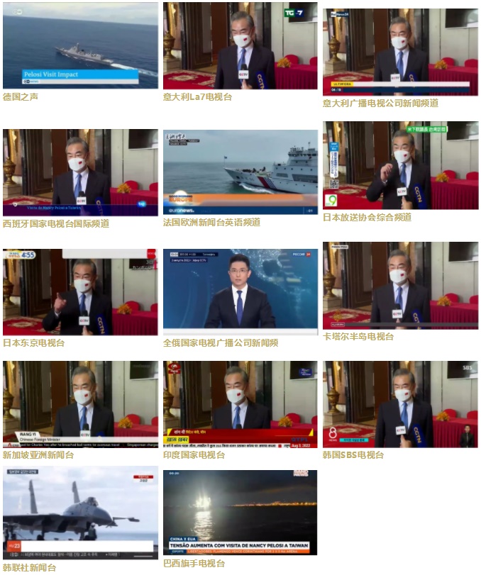 總臺(tái)亞非中心制作的外交部、全國人大常委會(huì)、中共中央臺(tái)灣工作辦公室、全國政協(xié)外事委員會(huì)、國防部、東部戰(zhàn)區(qū)、王毅國務(wù)委員兼外長(zhǎng)發(fā)表的相關(guān)聲明和談話得到了日本、韓國、印度、土耳其、印尼、伊朗等對(duì)象國250多家主流媒體轉(zhuǎn)載近5000篇次。