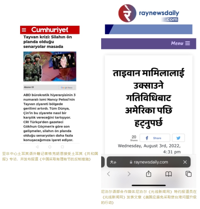 亞非中心土耳其、希伯來語、豪薩語、尼泊爾語、蒙古語等多語種主播、評(píng)論員和網(wǎng)紅積極在多家外媒發(fā)聲,接受了包括以色列電視臺(tái)、土耳其AHABER新聞臺(tái)、土耳其TGRT電視臺(tái)、土耳其新聞電視臺(tái)等多家國際媒體的采訪連線,同時(shí)多名外籍記者、海外特約評(píng)論員在尼日利亞《領(lǐng)導(dǎo)者報(bào)》網(wǎng)站、尼泊爾《光線新聞網(wǎng)》、肯尼亞《人民報(bào)》、蒙古國媒體SONIN.MN等對(duì)象國主流媒體發(fā)表評(píng)論及署名文章,對(duì)外闡釋中方立場(chǎng)和反制措施的合理性、正當(dāng)性,介紹臺(tái)灣問題歷史經(jīng)緯,揭批美國在臺(tái)灣問題上的背信棄義。