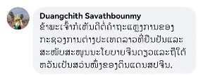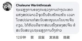 老撾新聞文化旅游部前副部長(zhǎng)扎倫·瓦林塔薩(Chaleune Warinthrasak)留言:“老撾外交部的聲明及時(shí)而嚴(yán)正,任何時(shí)候我們只支持一個(gè)中國原則,臺(tái)灣是中國不可分割的一部分。”