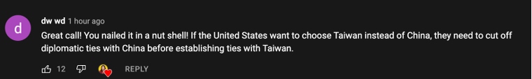 網(wǎng)友dw wd:“精彩的一期視頻!你簡(jiǎn)潔而清晰地呈現(xiàn)了內(nèi)容,如果美國真的想選擇與臺(tái)灣建立所謂的‘外交關(guān)系’,他們首先需要與中國斷交?!?/p>