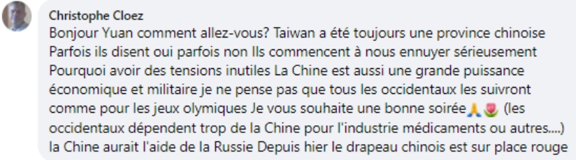 法語網(wǎng)友克羅茲:“臺(tái)灣始終是中國的一個(gè)省,美國人一會(huì)兒承認(rèn)一會(huì)兒又不承認(rèn),現(xiàn)在他們又開始搗亂。為什么要制造這種毫無意義的緊張氣氛呢?中國是一個(gè)經(jīng)濟(jì)和軍事大國,我不認(rèn)為西方會(huì)跟著美國走,就像之前的奧運(yùn)會(huì)一樣,西方國家太依賴于中國工業(yè)了。俄羅斯應(yīng)該是支持中國的吧,昨天紅場(chǎng)上方都飄著中國國旗?!?/p>
