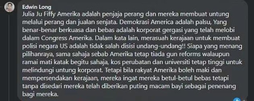 馬來西亞網(wǎng)友Edwin Long留言:“美國就是戰(zhàn)爭(zhēng)販子,他們通過戰(zhàn)爭(zhēng)和販賣武器獲利。美國的民主只是假象,真正享有權(quán)力和自由的是在幕后主導(dǎo)國會(huì)的大企業(yè)。換句話說,官商勾結(jié)在美國的法律上是被允許的!無論誰贏得選舉,一樣不會(huì)禁槍,醫(yī)療和教育成本還是不會(huì)下降,因?yàn)橐S護(hù)大企業(yè)的利益。但是他們的人民覺得他們能罵政府就是自由的,全然沒有意識(shí)到這不過是安撫奶嘴罷了。”
