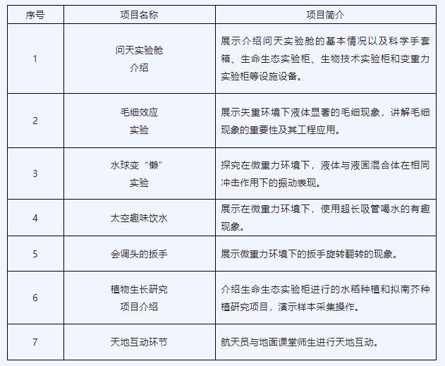 本次太空授課活動將繼續(xù)采取天地互動方式進(jìn)行,3名航天員將在軌介紹展示中國空間站問天實(shí)驗(yàn)艙工作生活場景,演示微重力環(huán)境下毛細(xì)效應(yīng)實(shí)驗(yàn)、水球變“懶”實(shí)驗(yàn)、太空趣味飲水、會調(diào)頭的扳手以及植物生長研究項(xiàng)目介紹,并與地面課堂進(jìn)行互動交流(授課內(nèi)容介紹附后),旨在傳播普及載人航天知識,激發(fā)廣大青少年對科學(xué)的興趣。