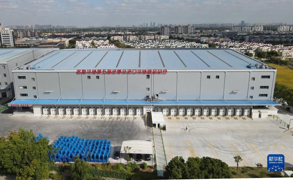 10月20日,空中俯瞰位于上海青浦區(qū)的名聯(lián)冷鏈第五屆進(jìn)博會進(jìn)口冷鏈?zhǔn)称房倐}(無人機(jī)照片)。新華社記者 方喆攝