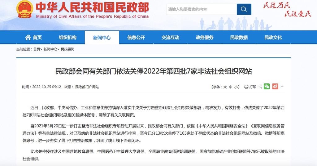 此次關(guān)停操作涉及中國營地教育聯(lián)盟、中國醫(yī)藥衛(wèi)生管理大學聯(lián)盟、全國職業(yè)教育師資培訓聯(lián)盟、國家節(jié)能減碳產(chǎn)業(yè)創(chuàng)新聯(lián)盟、中國監(jiān)督網(wǎng)浙江象山辦事處、中國煤礦創(chuàng)傷學會華北分會、全心犬意犬類領養(yǎng)中心等7家已被取締的非法社會組織。