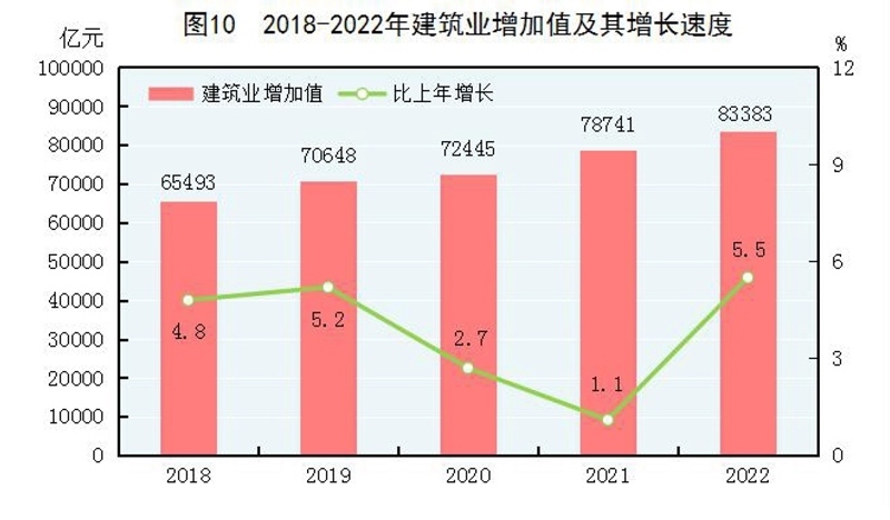 全年建筑業(yè)增加值83383億元,比上年增長(zhǎng)5.5%。全國(guó)具有資質(zhì)等級(jí)的總承包和專業(yè)承包建筑業(yè)企業(yè)利潤(rùn)8369億元,比上年下降1.2%,其中國(guó)有控股企業(yè)3922億元,增長(zhǎng)8.4%。