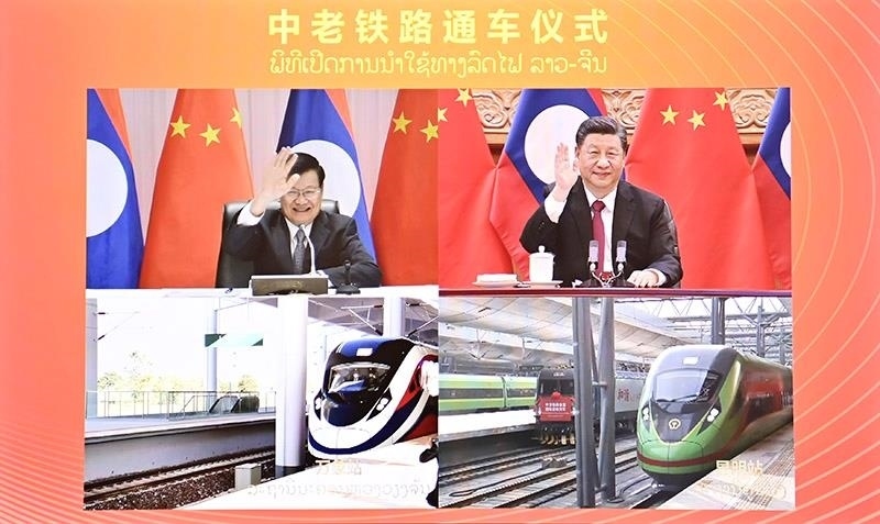 △2021年12月3日,中共中央總書記、國(guó)家主席習(xí)近平在北京同老撾人民革命黨中央總書記、國(guó)家主席通倫通過(guò)視頻連線共同出席中老鐵路通車儀式。