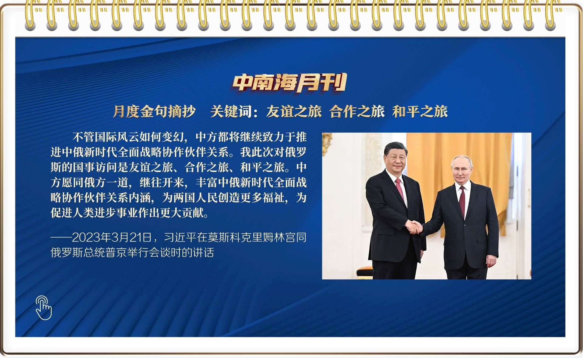 央視網(wǎng)《中南海月刊》運(yùn)用智能大數(shù)據(jù),與您一起回顧習(xí)近平總書記3月份繁忙的工作和講話,感受我們共和國(guó)前進(jìn)掌舵者、人民幸福領(lǐng)路人赤誠(chéng)的為民情懷和天下胸懷。