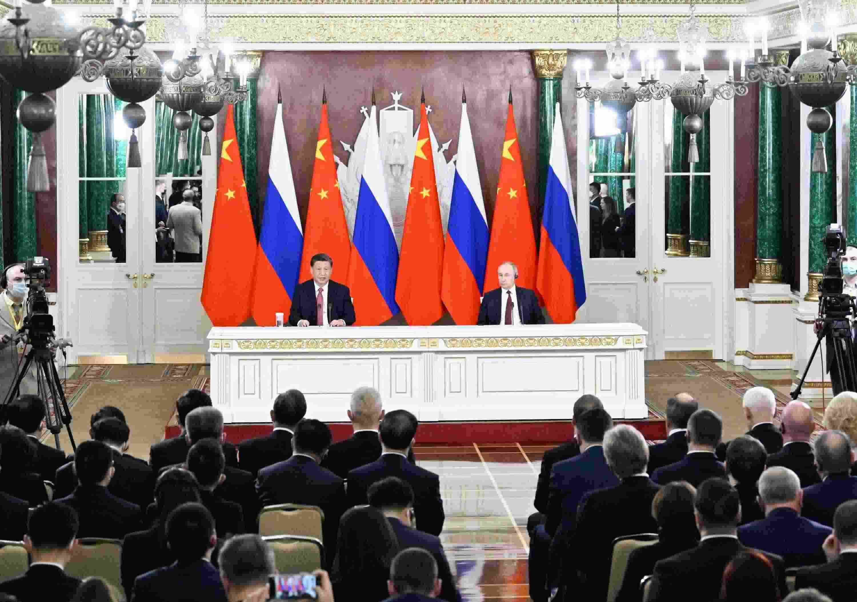 當(dāng)?shù)貢r(shí)間3月21日下午,國(guó)家主席習(xí)近平在莫斯科克里姆林宮同俄羅斯總統(tǒng)普京舉行會(huì)談。這是會(huì)談后,兩國(guó)元首共同會(huì)見記者。