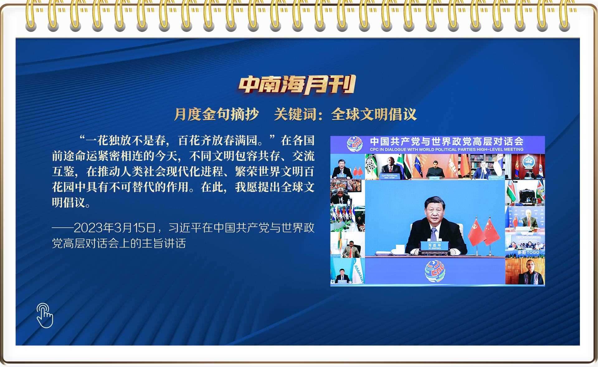 帶著對(duì)人類文明過去、現(xiàn)在和未來的深邃思考,習(xí)近平總書記在本月舉辦的全球性政黨盛會(huì)上,以四個(gè)“共同倡導(dǎo)”為實(shí)現(xiàn)路徑,鄭重提出全球文明倡議。繼全球發(fā)展倡議、全球安全倡議之后,這一中國(guó)智慧再次引發(fā)全球共鳴。