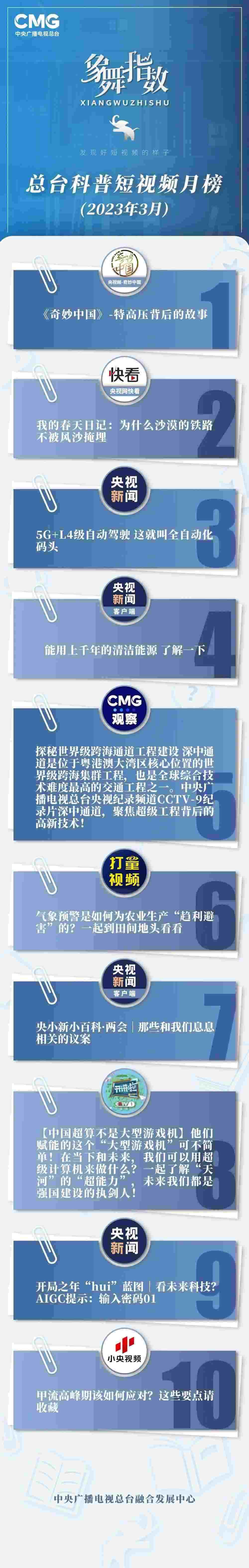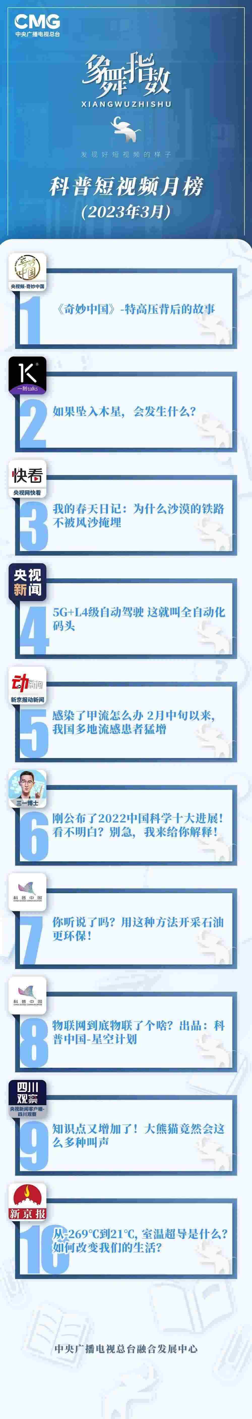 中央廣播電視總臺“象舞指數(shù)”評議品牌,推出科普短視頻月榜、總臺科普短視頻月榜。在2023年3月,值得注目的內(nèi)容有:
