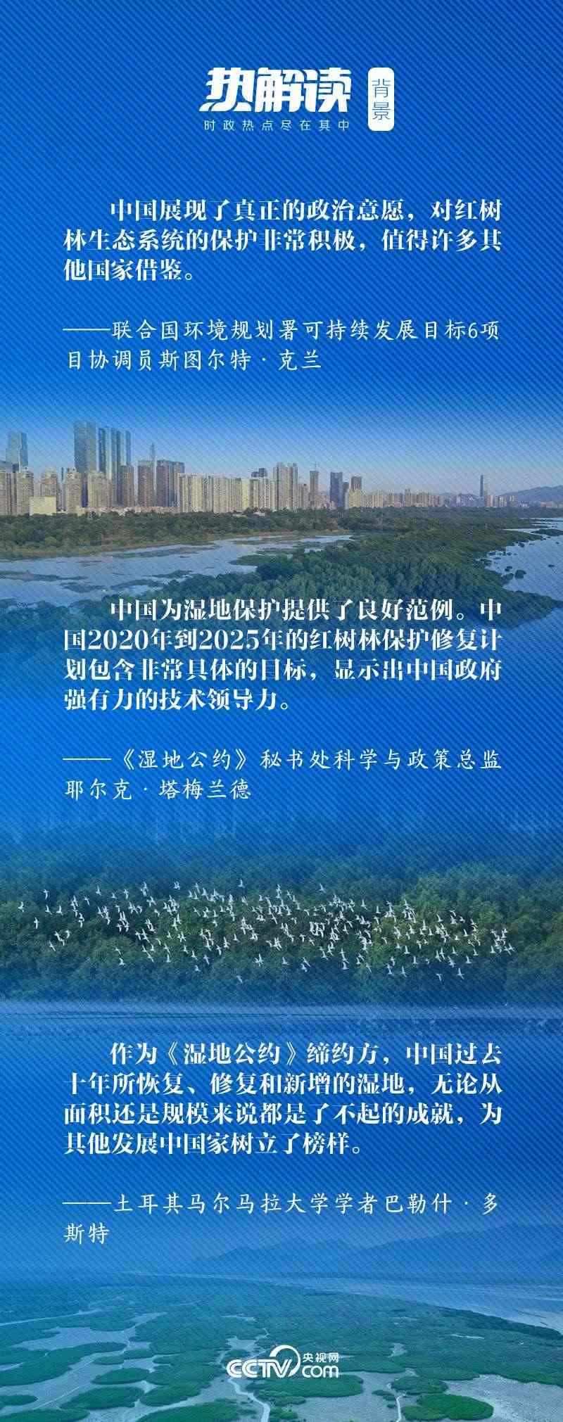 2022年11月5日,習(xí)近平主席以視頻方式出席《濕地公約》第十四屆締約方大會(huì)開幕式并發(fā)表致辭,他向世界宣布中國(guó)將在深圳建立“國(guó)際紅樹林中心”。海內(nèi)外輿論認(rèn)為,此舉充分體現(xiàn)了中國(guó)對(duì)沿海生態(tài)特別是紅樹林保護(hù)的關(guān)心和重視。