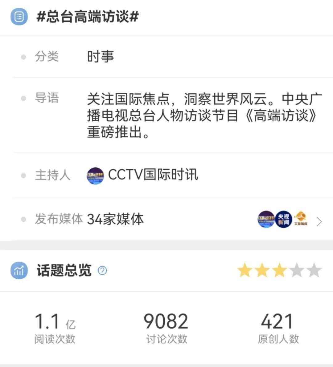 在充分調(diào)研的基礎(chǔ)上,《高端訪談》的采訪敢于碰真問題、硬問題,緊扣當(dāng)下熱點,以觀點鮮明、針對性強、易于傳播的重磅采訪報道主動設(shè)置議題,奮力提升中國聲音在國際輿論場中的話語權(quán)。